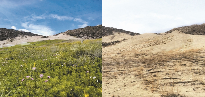 圖為空港新區防沙治沙與生態修復試驗項目中同一處坡面生態修復前(右)與生態修復后(左)的對比。拉薩融媒記者 凃 瓊攝
