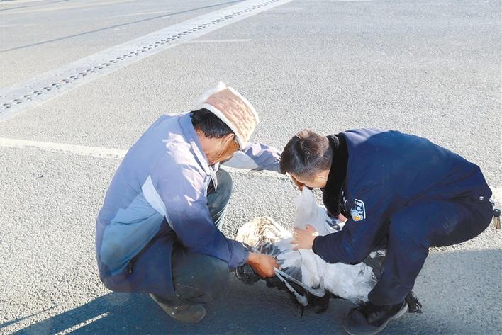 民警迅速到達現場了解得知:報案人普某路過年楚河大橋時發現一只飛行中的鳥撞到電線后落地,導致其右側翅膀受傷,無法正常飛行,遂報警求助。經過仔細觀察,民警懷疑該鳥為國家一級保護動物——黑頂鶴,于是在上報指揮中心的同時,與桑珠孜區林業局取得聯系。