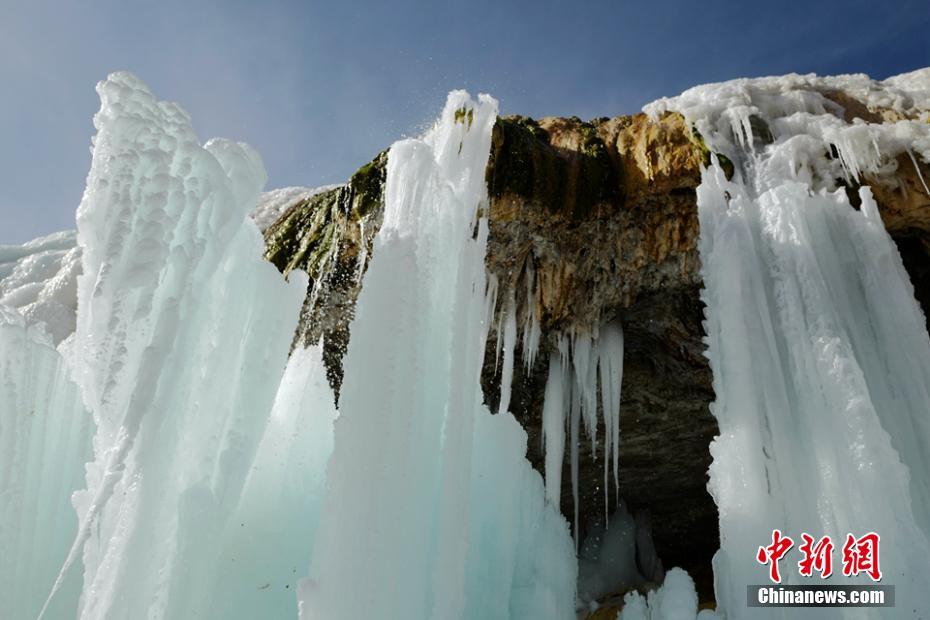 2021年1月23日,祁連山國家公園崗什卡雪峰山腳下的七彩冰瀑,由于溪水中含有多種礦物質,在冬日暖陽的照耀下,散發出五彩繽紛的綺麗風光,蔚為壯觀。中新社發 成 林 攝