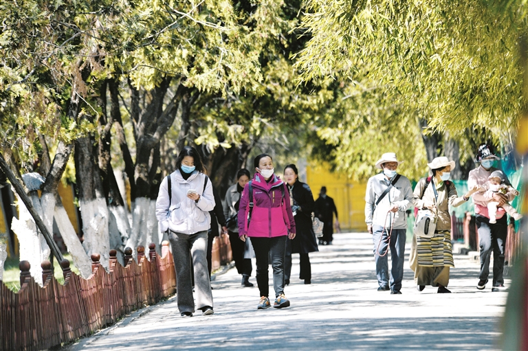 春風送暖,四月的拉薩逐漸退去冬日銀妝。湛藍的天空下,柳樹舒展開了黃綠嫩葉的枝條,在微微的春風中輕柔地拂動,就像一群群身著綠裝的仙女在翩翩起舞,夾在柳樹中間的桃樹也開出了鮮艷的花朵,綠的柳,紅的花,真是五彩繽紛,令人目不暇接。