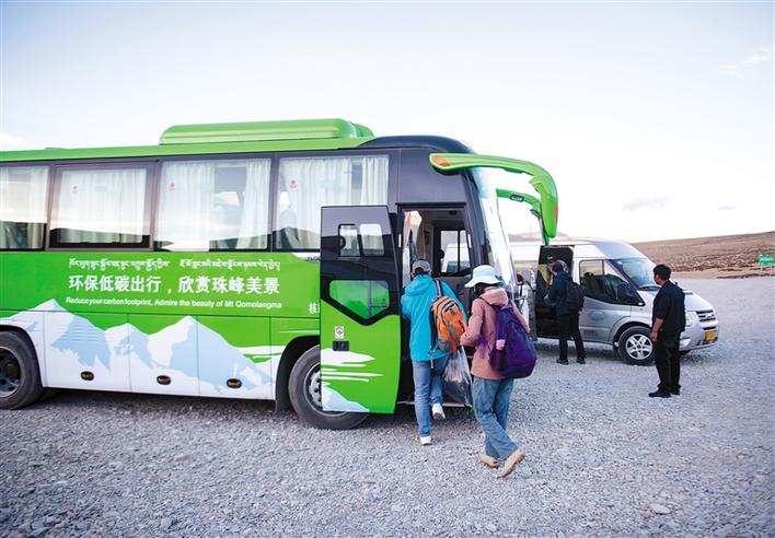 游客在珠穆朗瑪峰景區停車場轉乘環??蛙嚕?019年5月16日攝)。珠穆朗瑪峰景區內自2019年5月開始試運營清潔能源環保客車,以進一步平衡珠峰地區旅游發展與環境保護需要。新華社記者 孫非 攝