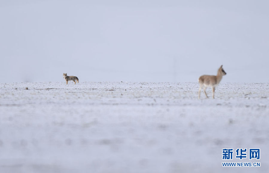 在可可西里地區拍攝的一只狐貍(左)和一只遷徙途中的藏羚羊(4月20日攝)。新華社記者 吳剛 攝