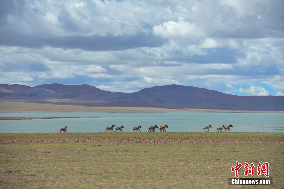 6月19日,西藏那曲羌塘草原上的藏野驢在湖邊奔騰跳躍。羌塘草原位于西藏自治區(qū)北部,平均海拔超過(guò)4600米,是目前中國(guó)海拔最高、面積最大的自然保護(hù)區(qū)。這里是野生動(dòng)物的樂(lè)園,藏羚羊、藏原羚、藏野驢等珍稀野生動(dòng)物與雪山、草地、藍(lán)天、白云,構(gòu)成撼人心魄的壯美畫面。 中新社記者 貢嘎來(lái)松 攝