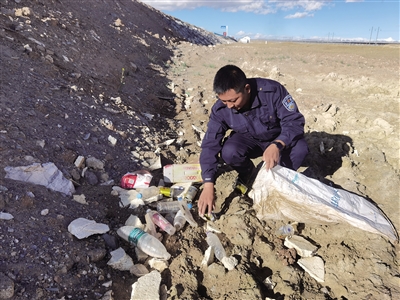 可可西里索南達杰保護站工作人員在109國道沿線撿拾被丟棄的垃圾。可可西里管理處供圖