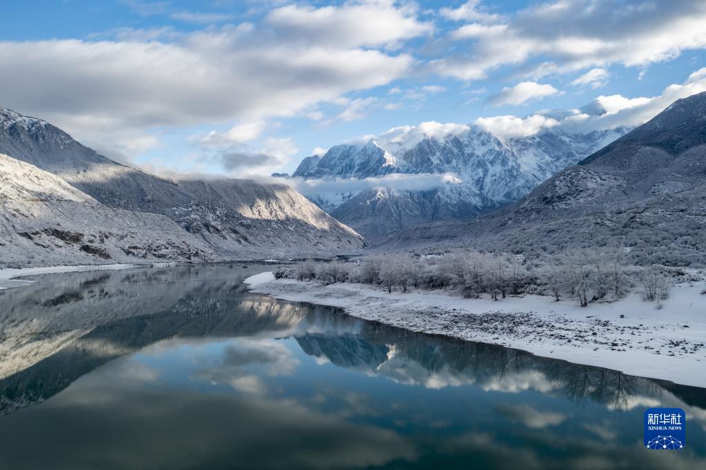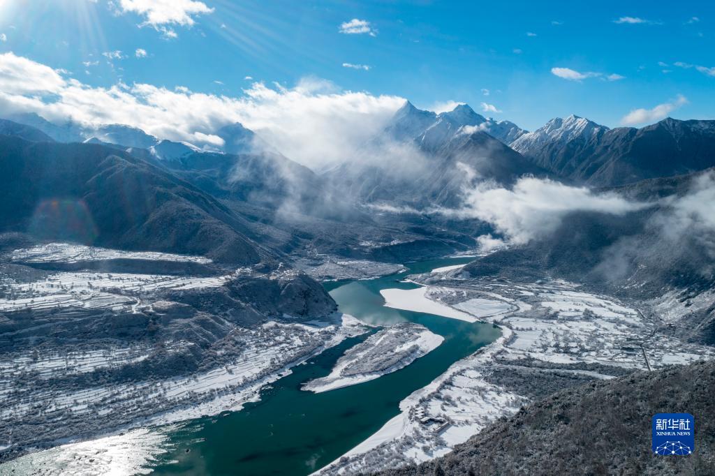 當日,西藏林芝市米林縣派鎮雅魯藏布大峽谷附近普降瑞雪,銀裝素裹的雅魯藏布江和南迦巴瓦峰顯得格外壯美。