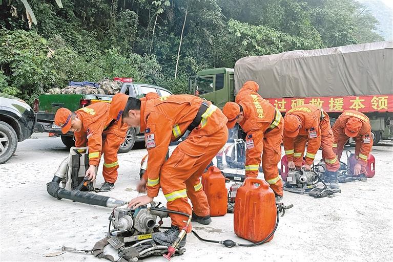圖為在重特大森林火災長途機動滅火增援實戰演練過程中,消防救援人員對裝備進行檢查維修。圖片由昌都市森林消防支隊提供