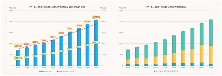 經濟健康快速發展,地區生產總值由2012年的710.16億元增長至2021年的2080.17億元。十年來,西藏地區生產總值增長了152.6%,年均增長9.7%。