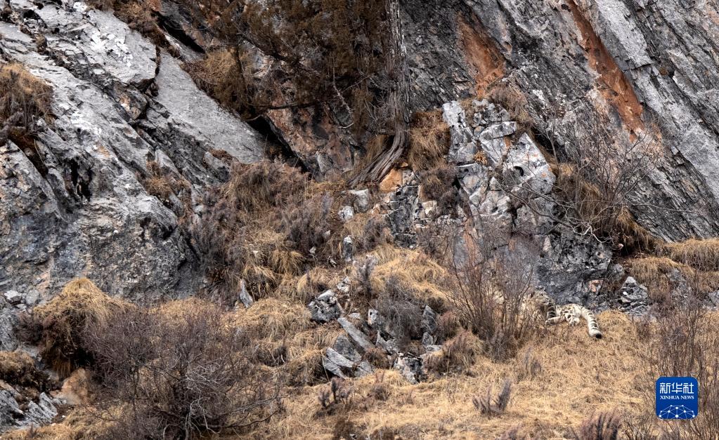 2月21日,在青海省玉樹藏族自治州雜多縣昂賽鄉(xiāng)境內(nèi)的昂賽大峽谷內(nèi),一只雪豹在休息。新華社記者 費(fèi)茂華 攝