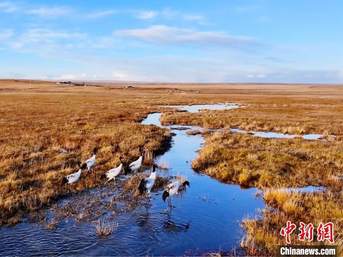 金秋十月,位于青海湖北岸的草原一片金黃。攝影愛好者在青海省海北藏族自治州剛察縣吉爾孟鄉日格加柔地區,拍攝到六只黑頸鶴在這里“安家落戶”,它們或擠在一起沐浴秋日的暖陽,或三五成群覓食嬉戲、閑庭信步,為草原增添了一份靈動與生機。黑頸鶴被稱為“高原仙子”“鳥類大熊貓”,是全球十五種鶴類中唯一在高原繁殖和棲息的鶴類。