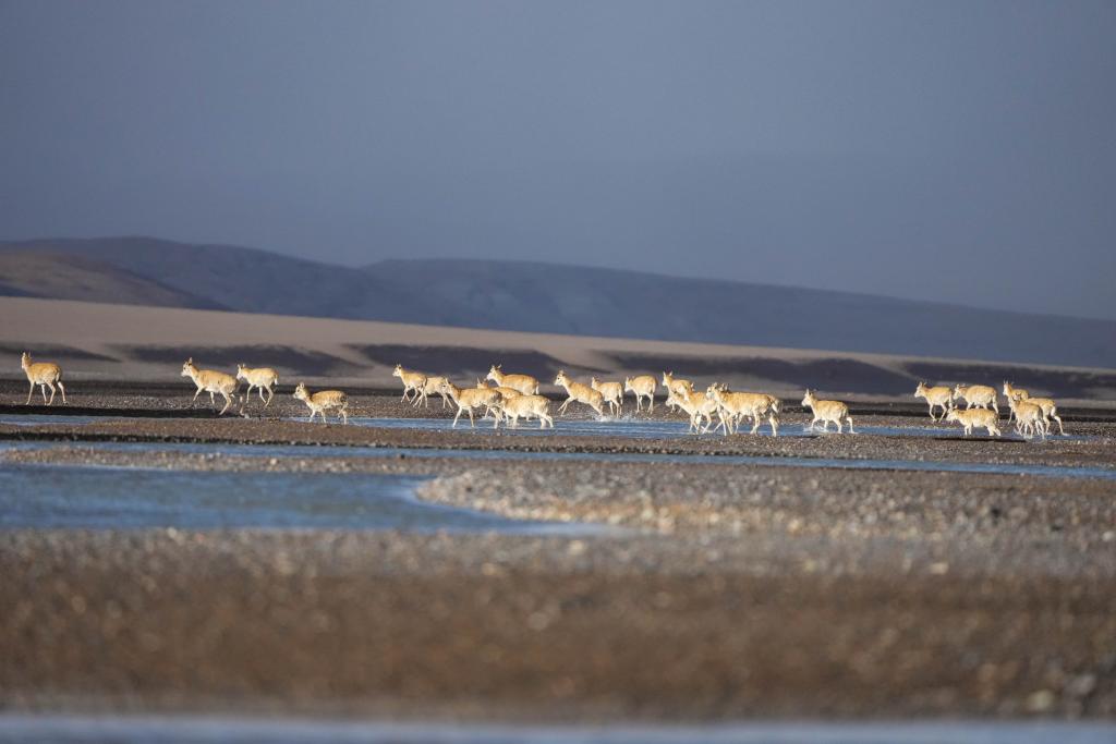 6月13日傍晚,在羌塘國家級自然保護區(qū),遷徙中的母藏羚羊越過甜水河。