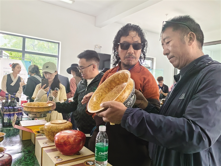 探訪團在加查縣的非物質文化遺產展覽上被加查服飾、竹編、石鍋和加查木碗等傳統手工藝品所吸引,這些手工藝品不僅展示了山南豐富的文化底蘊,還體現了當地人民對美好生活的追求和向往。