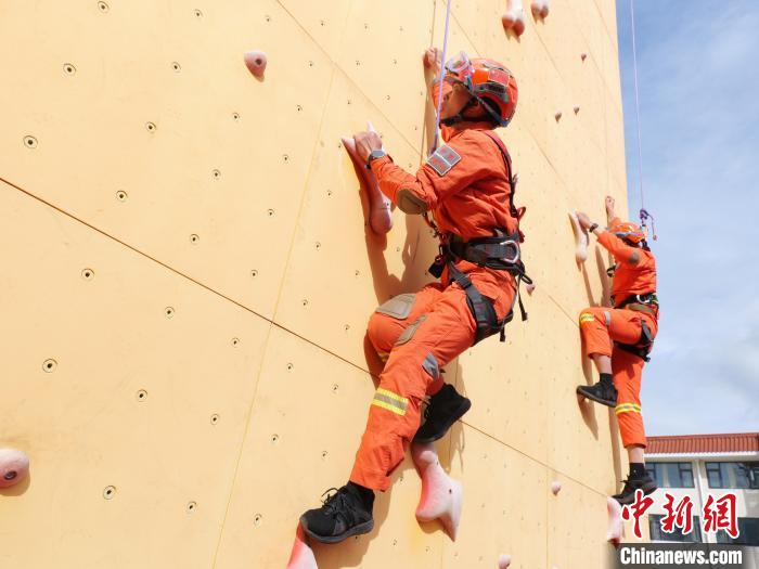 圖為訓練中消防員正在奮力攀爬。扎西頓珠 攝