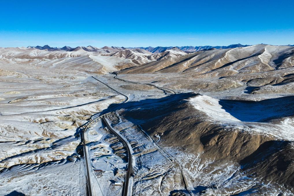這是12月1日在昆侖山口拍攝的青藏公路(右)與青藏鐵路。新華社記者 張龍 攝