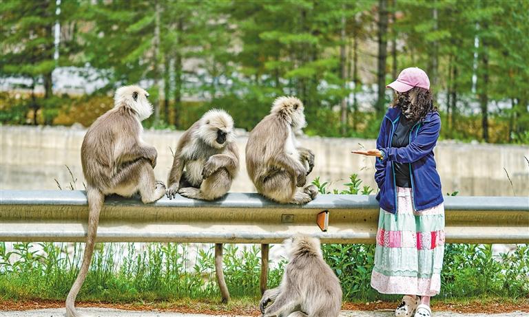 圖為6月20日,在亞東縣一條公路邊,游客在和長(zhǎng)尾葉猴互動(dòng)。新華社記者 丁增尼達(dá) 攝
