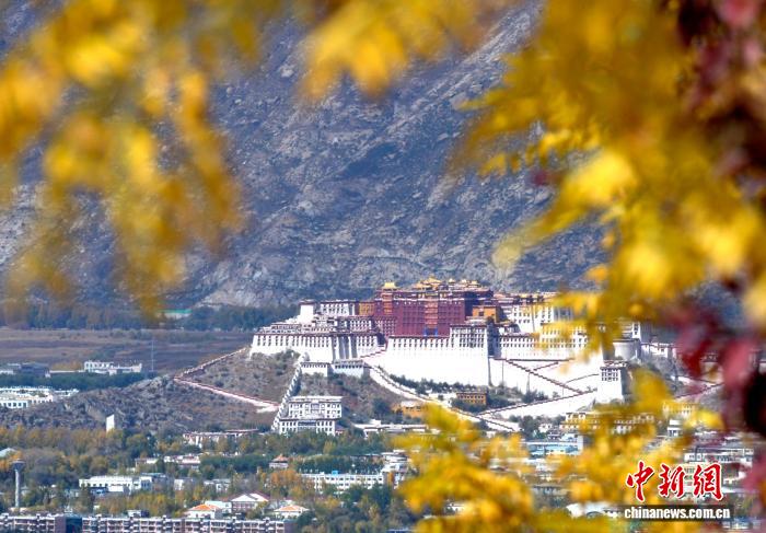 10月20日,西藏拉薩深秋如畫。圖為拉薩天堂草原自然風景區的黃葉與布達拉宮相映成趣。中新社記者 李林 攝