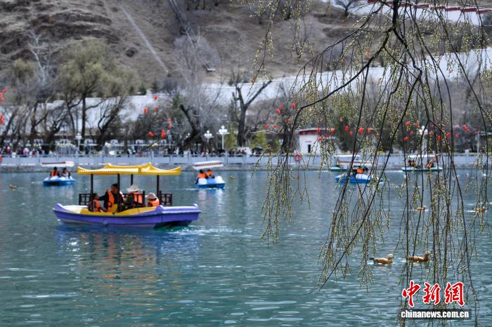 3月8日,西藏拉薩宗角祿康公園,市民乘游船賞春。陽春三月,古城拉薩楊柳發芽、桃花初放,春意漸濃。中新社記者 貢嘎來松 攝