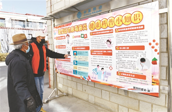 為大學生志愿者扎西平措在塔瑪小區(qū)內(nèi)的宣傳欄前給路過的居民普及防控知識。。(本組圖片由拉薩融媒視覺組攝)