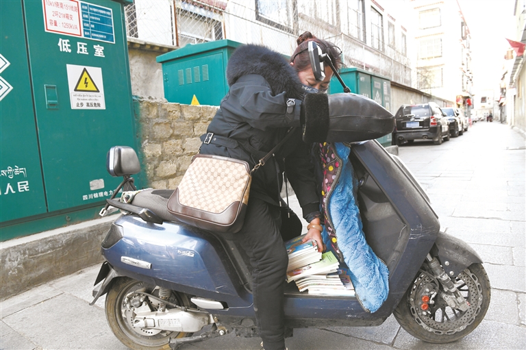 圖為城關區第二小學三年級(11)班班主任旦增色珍騎著電動車把分類分揀好的教材送到學生家中。