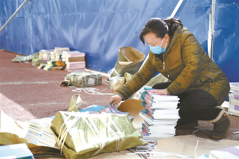 圖為城關區雪小學一年級(3)班次旦卓嘎老師在分揀本班教材。(本組圖片由拉薩融媒視覺組攝)