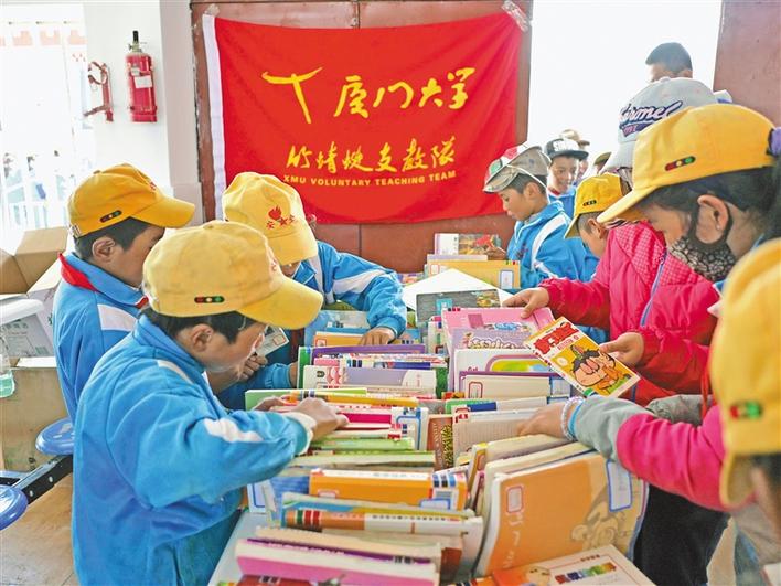 圖為廈門大學竹蜻蜓支教隊在當雄縣龍仁鄉中心小學舉辦流動圖書館活動。通訊員 黃宇霞 高捷 何春雨 崔慶煒