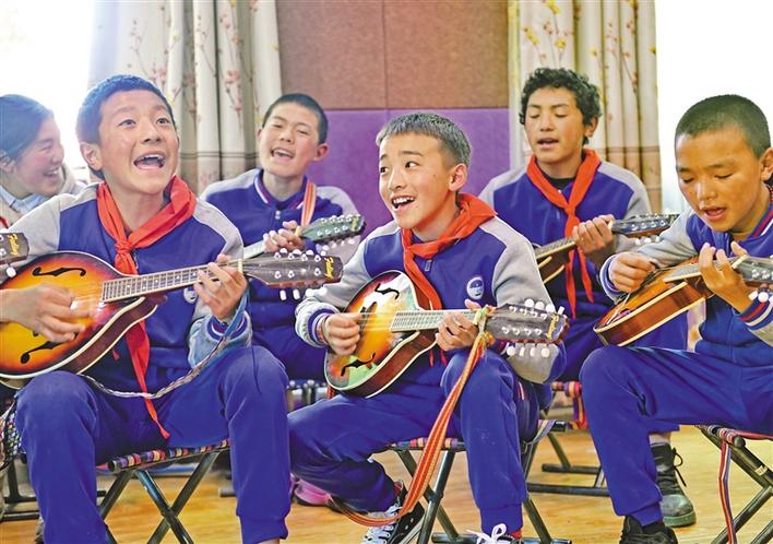 翻越重重大山,穿行茫茫草原,記者來到了四川阿壩藏族羌族自治州阿壩縣。縣民族寄宿制小學內的少年宮里,傳來一陣“嘣嘣嚓”“嘣嘣嘣嚓”的聲音。這是孩子們在彈奏一種叫曼陀鈴的樂器,伴隨著琴弦發出的聲音,他們合唱著一首當地民謠。琴聲美妙極了,很像淅淅瀝瀝的細雨聲,落在心里,特別舒服。
