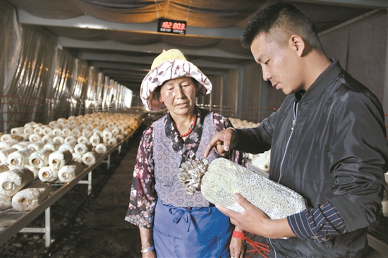 日前,記者來到林周縣大學生創業基地種菌大棚,看到兩名年輕小伙正在教授群眾菌菇種植知識。