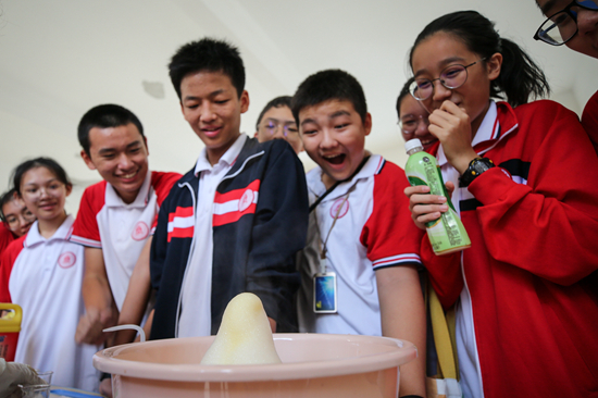 10月26日,北京師范大學海口附屬學校的學生參與化學趣味實驗。當日,北京師范大學海口附屬學校舉行第三屆科技人文節活動,在校內營造愛科學、學科學的良好氛圍。