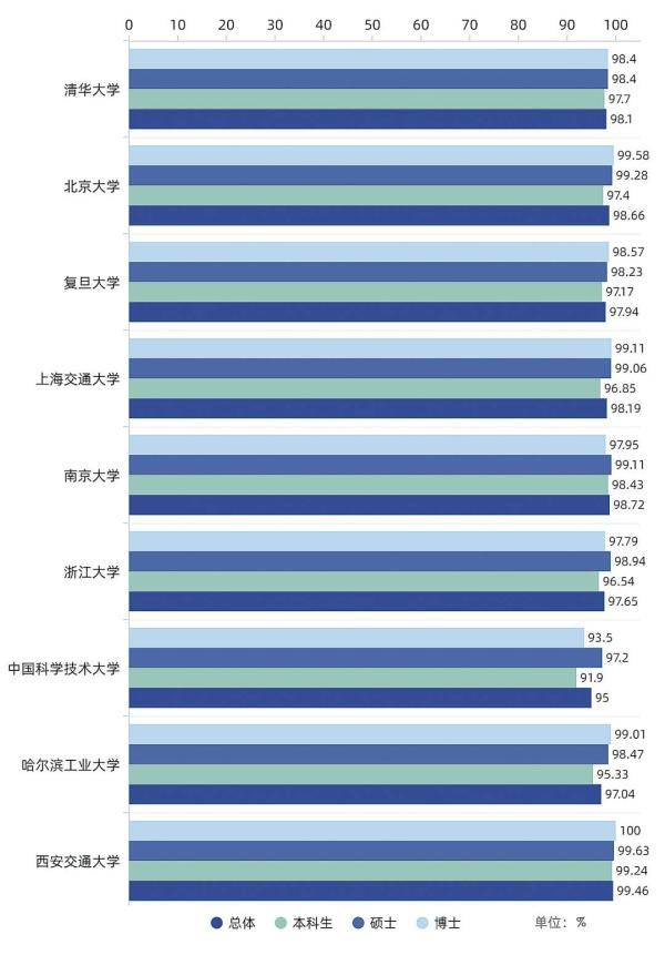 不過,南京大學(xué)成為個(gè)例,博士生就業(yè)率為97.95%,低于本科生和碩士生就業(yè)率。另外,除中國(guó)科大、浙大博士生就業(yè)率略低于碩士生就業(yè)率外,其他高校博士生就業(yè)率均為最高。