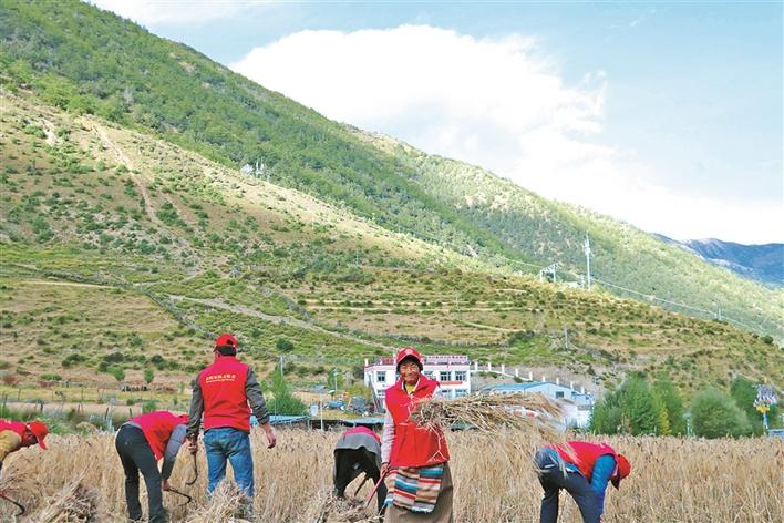 圖為朗縣拉多鄉新時代文明實踐巾幗志愿服務隊的隊員們正在幫助村民收割青稞。胡照躍 攝