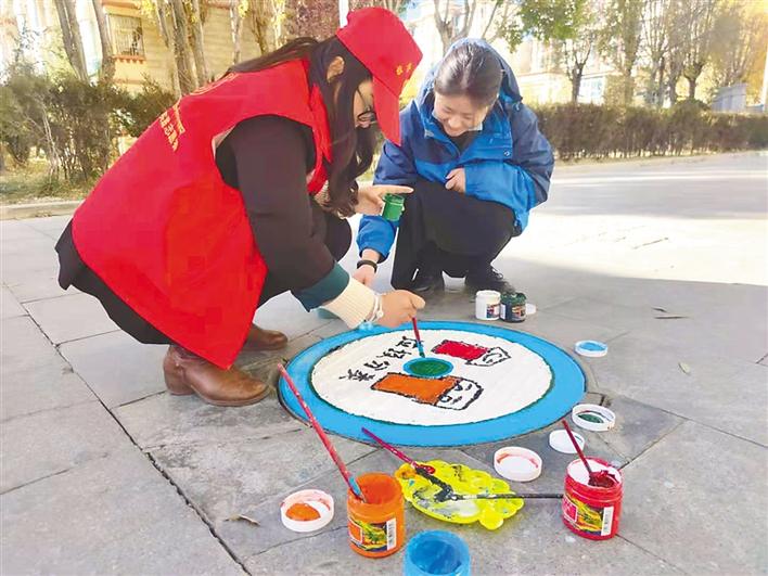 志愿者正在給井蓋涂鴉。記者 黃志武 攝
