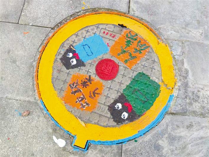 以環(huán)保、垃圾分類(lèi)為主題的各種彩繪圖案覆蓋上了井蓋,使得原本黑乎乎的井蓋一下變得活潑生動(dòng)起來(lái)。