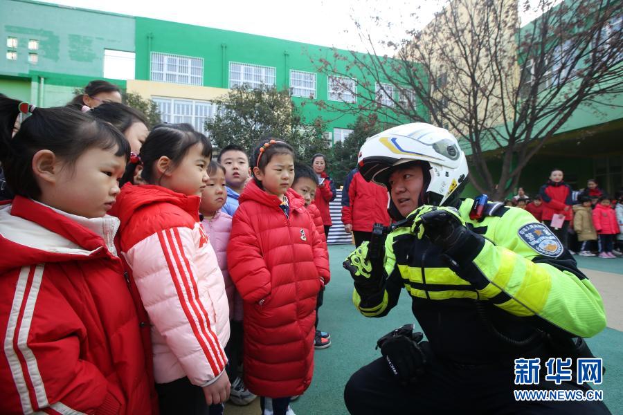 11月30日,交警在位于濟南市的山東省實驗幼兒園南校區指導孩子們識別交通安全標識牌。新華社發(郝群英 攝)