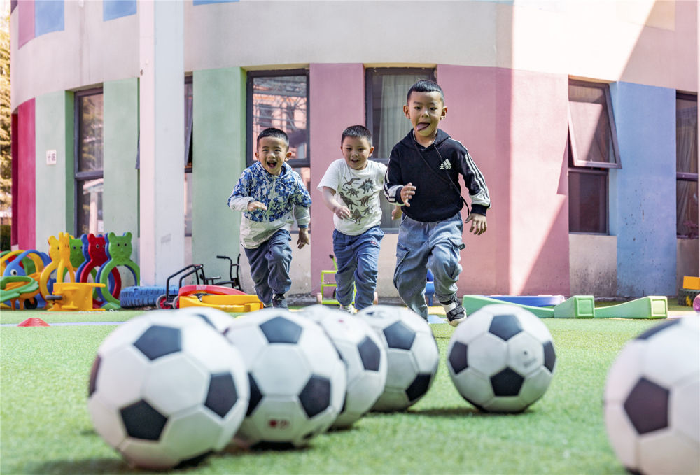 這是西藏自治區實驗幼兒園大班的孩子們進行足球訓練(2019年8月22日攝)。新華社記者 孫非攝