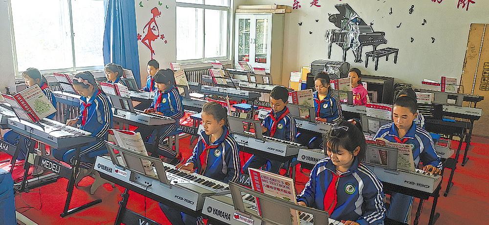 尖扎縣中學孩子們在學校少年宮學習電子琴。
