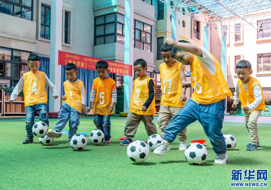 西藏自治區實驗幼兒園大班的孩子在進行足球訓練(2019年8月22日攝)。新華社記者孫非 攝
