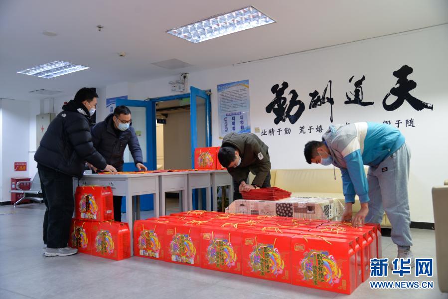 2月9日,北京交通大學輔導員和學生志愿者在整理為留校學生準備的新春禮包。新華社記者 徐欽 攝