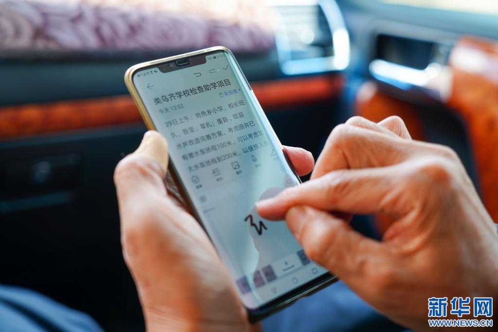 5月1日,李純民在前往西藏昌都市類烏齊縣伊日鄉小學途中,整理記錄此次進藏助學事宜。新華社記者 黃臻 攝