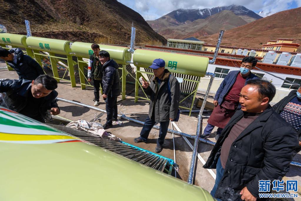 5月3日,在西藏昌都市類烏齊縣吉多鄉小學,李純民(中)在吉多鄉小學學生食堂樓頂,監督太陽能熱水器的維修工作。2014年至2020年,“齊興”助學獎勵基金通過多種方式,籌集資金200多萬,為類烏齊縣12所鄉鎮小學安裝太陽能熱水器和多媒體教學一體機。新華社記者 劉金海 攝