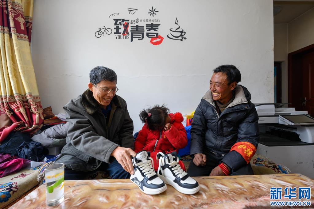 5月3日,在西藏昌都市類烏齊縣伊日鄉小學,扎西措姆(中)在父親帕巴澤仁(右)的陪伴下,接受李純民(左)贈予的一雙為她專門定制的新鞋。扎西措姆自幼患有足部殘疾,穿普通鞋子無法舒適行走。2020年,李純民個人出資為扎西措姆定制了一雙鞋。不久前,得知扎西措姆的鞋子穿破后,李純民再次為她定制了一雙新鞋。新華社記者 劉金海 攝