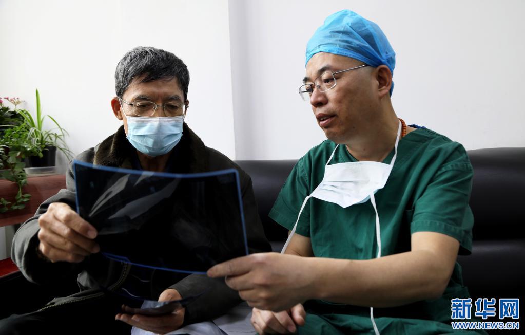 5月12日,李純民(左)與西藏昌都市藏醫院骨科天津援藏的李明新主任查看右腳殘疾女童扎西措姆的X光片。新華社記者 普布扎西 攝