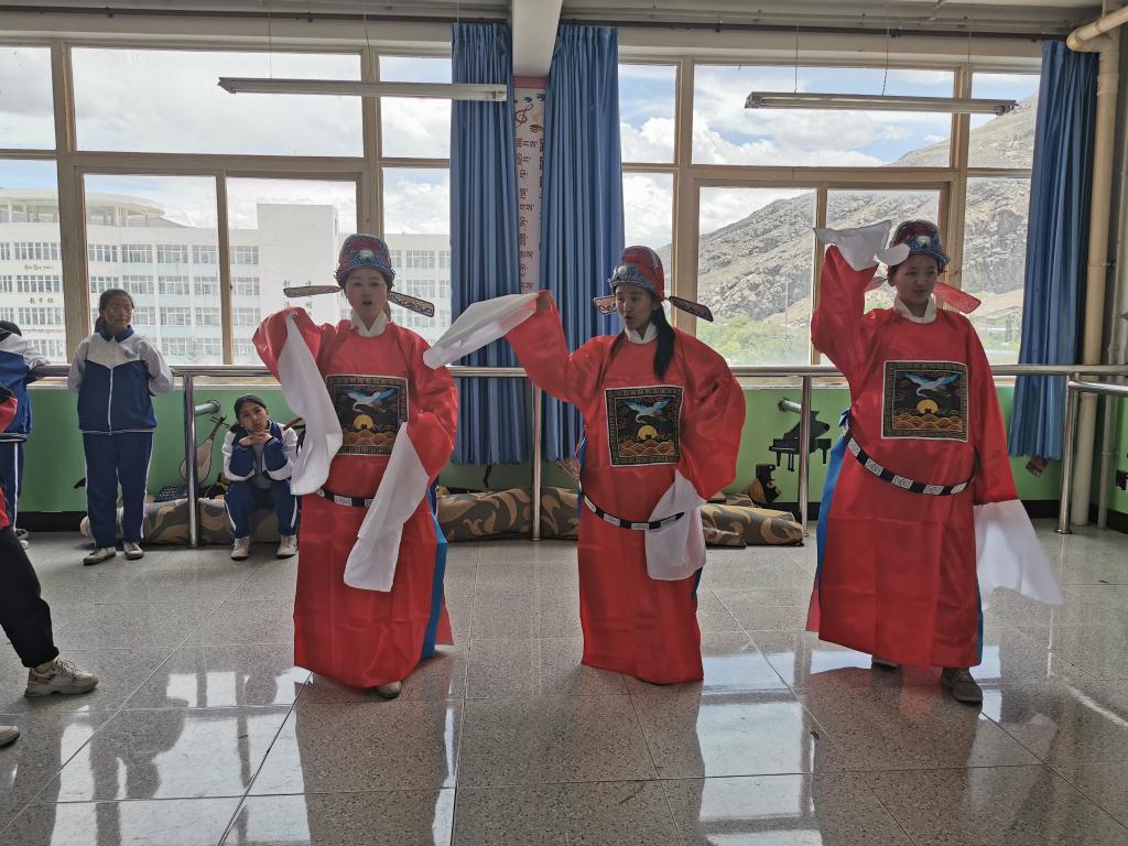 幾天相處下來,她看到藏族孩子能歌善舞的天性,便主動把家鄉的黃梅戲表演給學生。隨著學生對黃梅戲愈發好奇,金慧琳組建了全區首個藏漢雙語黃梅戲學生社團,并以黃梅戲代表性曲目《女駙馬》為藍本,以藏式歌舞為表現形式,進行創造性轉化和創新性發展。
