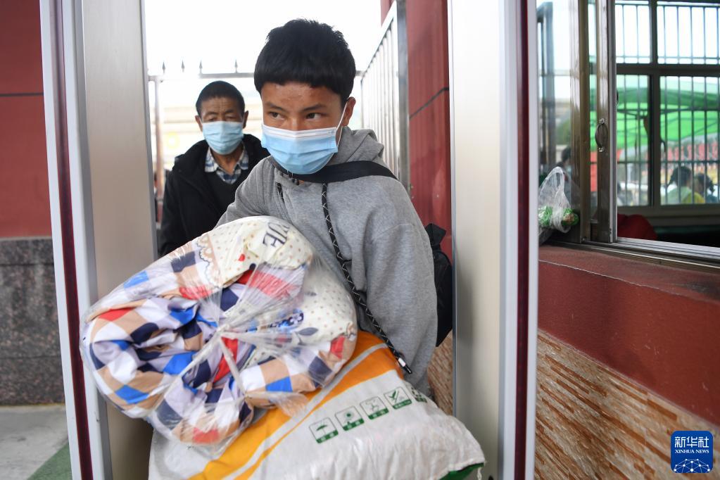 碌曲縣藏族中學(xué)高一新生帶著行李通過測溫門到學(xué)校報(bào)到(8月30日攝)。新華社記者 陳斌 攝