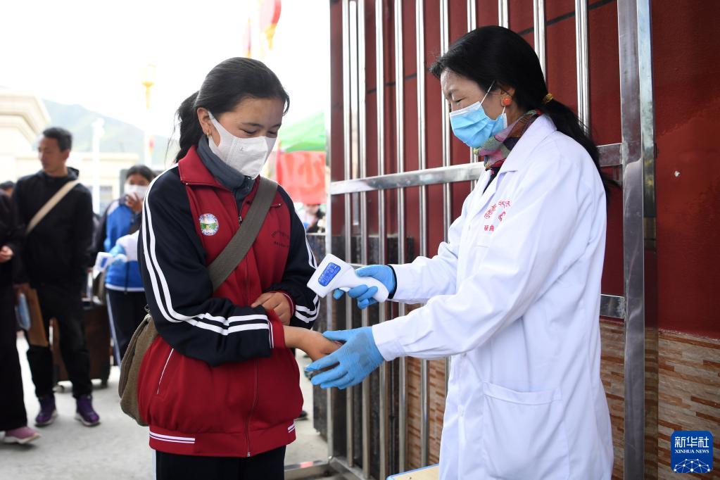 碌曲縣藏族中學(xué)學(xué)生進(jìn)入校園時(shí)測量體溫(8月30日攝)。新華社記者 杜哲宇 攝