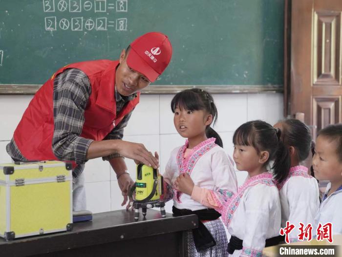 圖為孩子們體驗操作激光掃平儀。 李繼嬌 攝