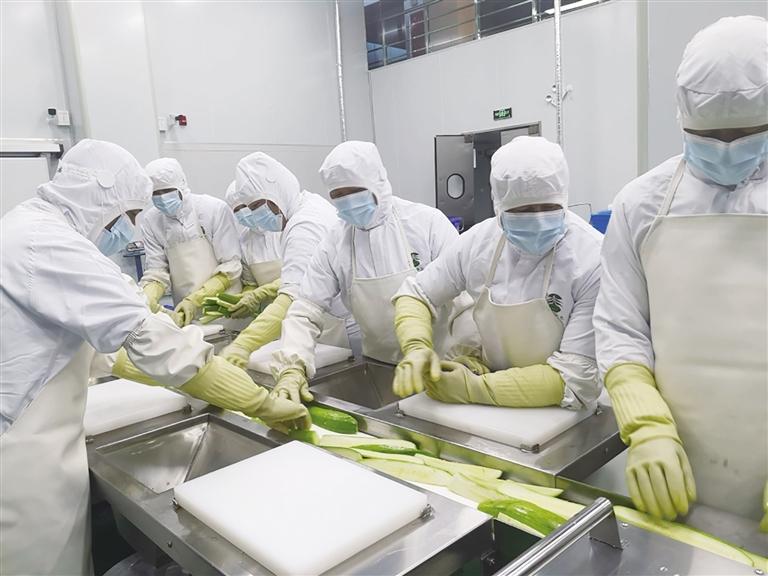 通過員工通道,在該廚房生產(chǎn)廠長甘文忠的指導(dǎo)下,記者穿上了白色工作服、戴上食品安全帽,換上高筒膠鞋,洗手消毒、測量體溫、隨身攜帶的手機、首飾全部摘掉后,通過腳踏池進入生產(chǎn)加工車間。