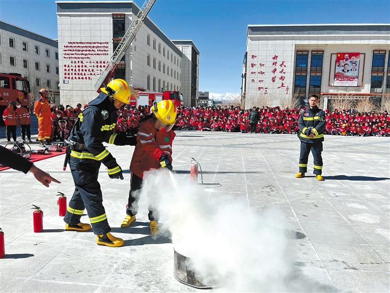 阿里陜西實驗學校學生在“開學第一課”中體驗消防滅火技能。普珍 記者 洛桑旦增 攝