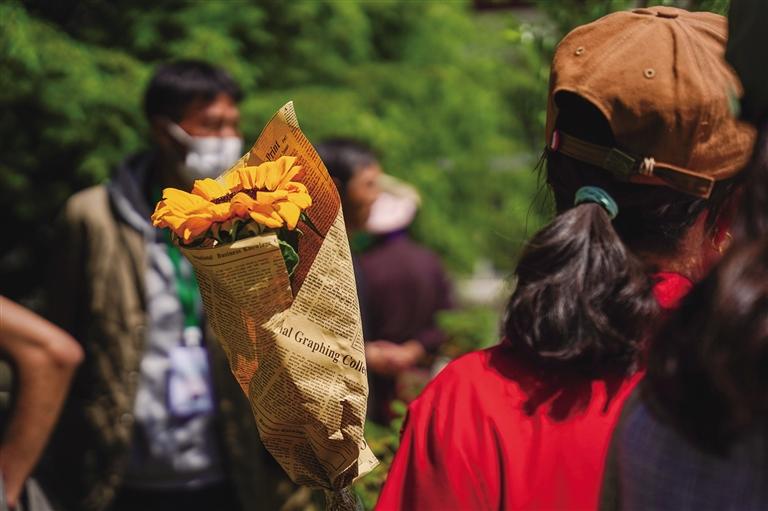 送考家長(zhǎng)手持向日葵 希望孩子“一舉奪葵”