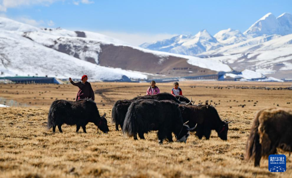 斯曲卓瑪(右)和爸爸、妹妹一起在草原上放牧間隙(11月15日攝)。新華社發(丁增尼達 攝)