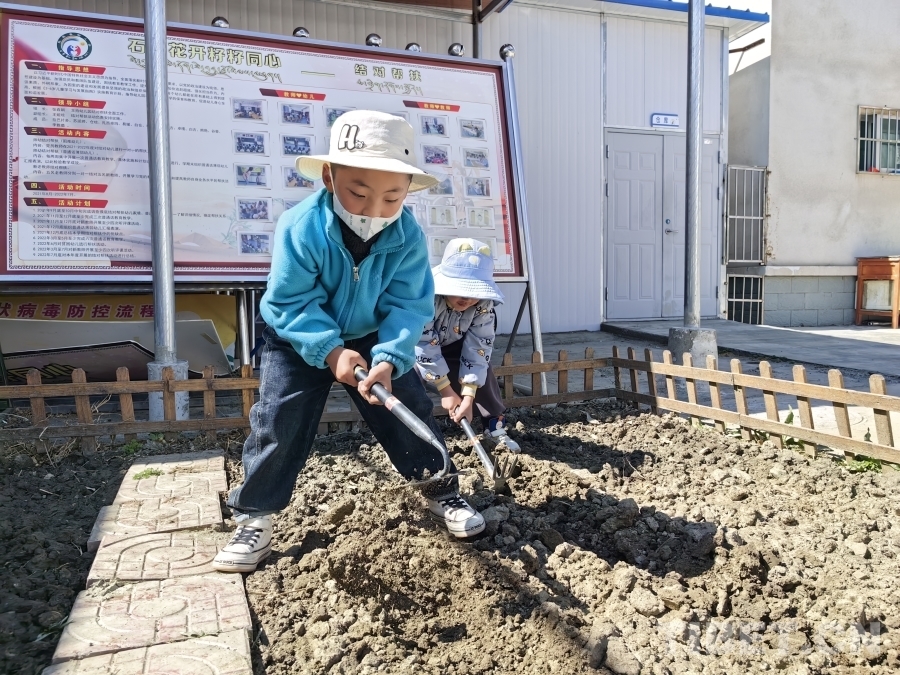 圖為拉孜縣幼兒園的孩子們在校園刨土種花