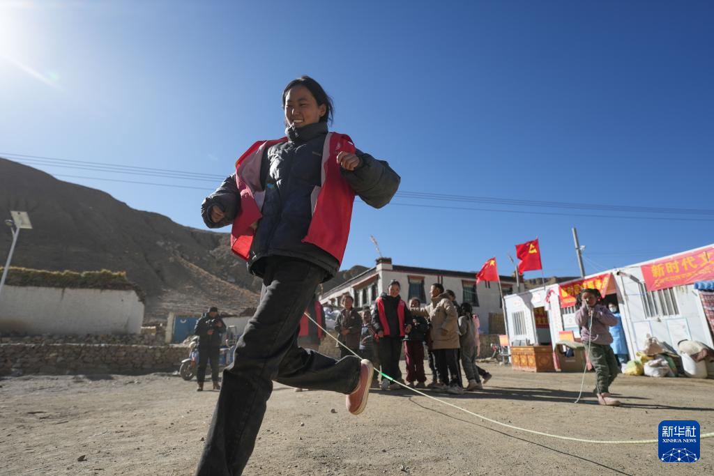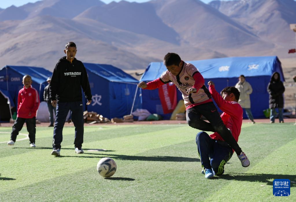 1月25日,在定日縣曲洛鄉熱木青村安置點,大學生志愿者在安置點和孩子們一起玩游戲。新華社記者 晉美多吉 攝